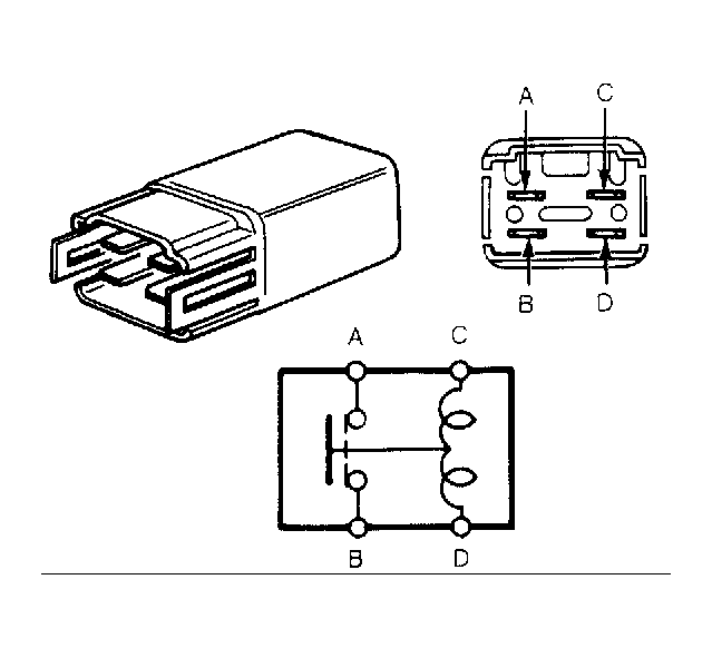 Check continuity between relay terminals "A" and "B". See Fig 1 . Continuity should not exist. Apply battery voltage across terminals "C" and "D". Continuity should exist between terminals "A" and "B". If continuity is not as indicated, replace relay.