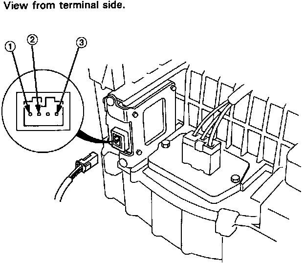 1. Connect battery power to the (1) terminal of the recirculation control motor connector and ground to the (2) and (3) terminals; the recirculation control motor should move smoothly.