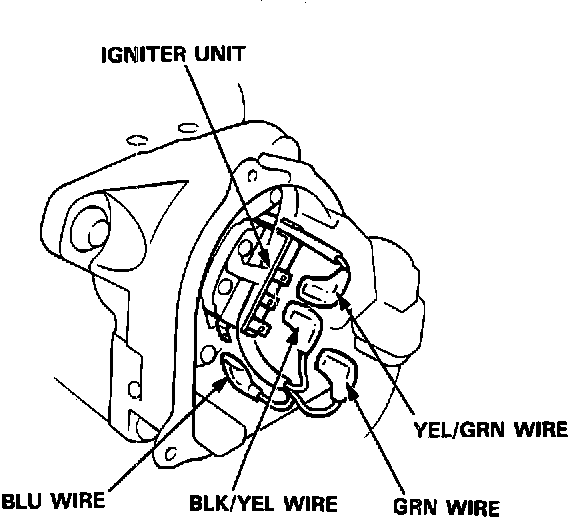 4. Turn the ignition switch ON. Check for voltage between the GRN wire and body ground. Battery voltage should be present. If there is no battery voltage, check the ignition coil and the GRN (BLU) wire between the ignition coil and the igniter unit.