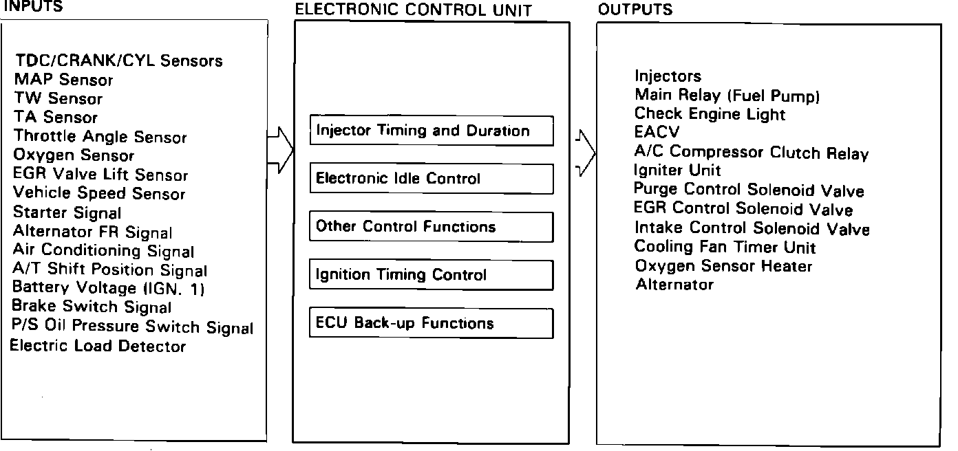The ECU contains memories for the basic discharge timing and duration of the fuel injectors at various engine speeds and manifold pressures. The basic discharge values are then modified by signals sent from various sensors to obtain the final injection values.