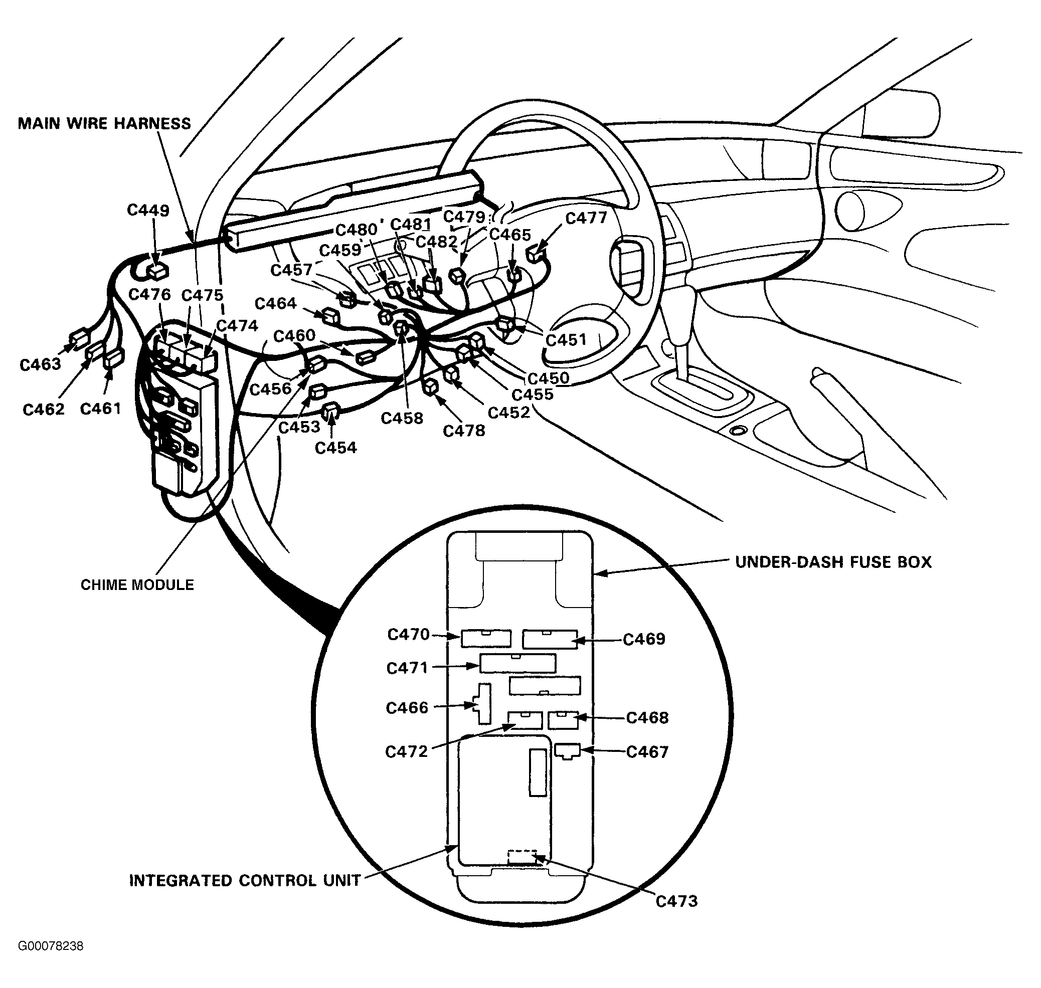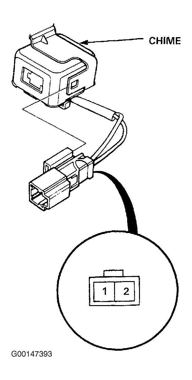 - Remove the dashboard lower cover and knee bolster. Disconnect the chime module 2-P connector from the main wire harness. See Fig 1 .