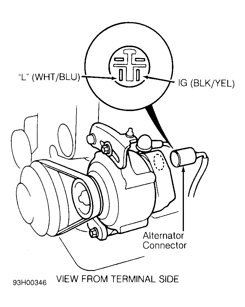 - With engine at normal operating temperature, remove alternator harness connector. See Fig 1. Turn ignition switch to ON position.