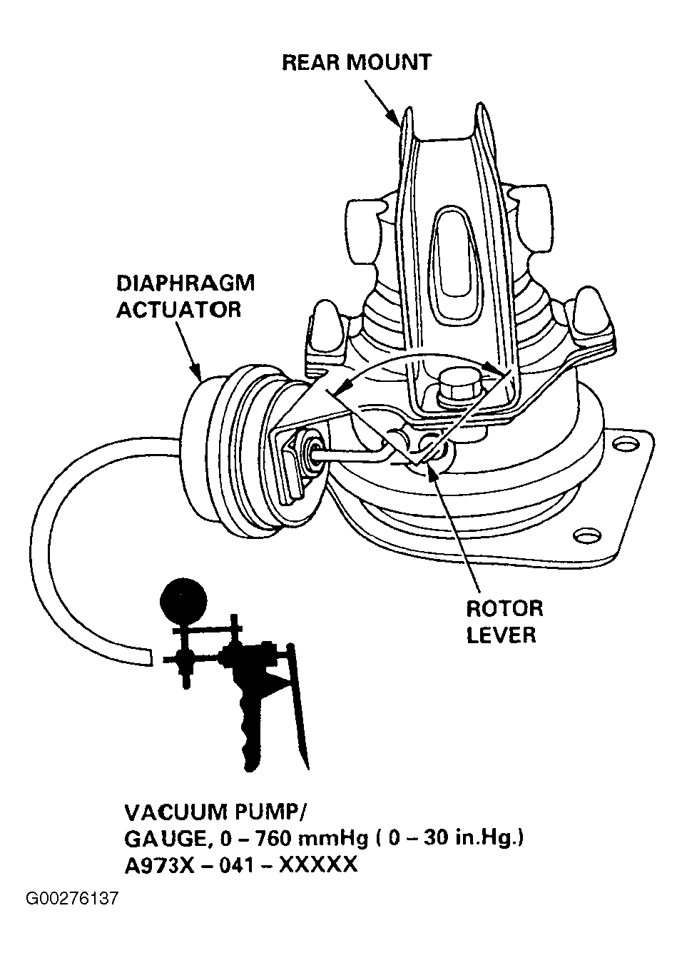 Disconnect vacuum hose from solenoid valve. Clean and oil diaphragm actuator rod, rear mount rotor lever, and lever linkage. Using a hand-held vacuum pump, apply about 9 in. Hg to actuator diaphragm. See Fig 1 . Actuator rod should move smoothly and diaphragm should hold vacuum. Replace as necessary. If engine mount is okay, go to next step.