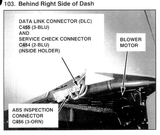 The Service Check Connector is a two pin connector located above the glove box hinge.