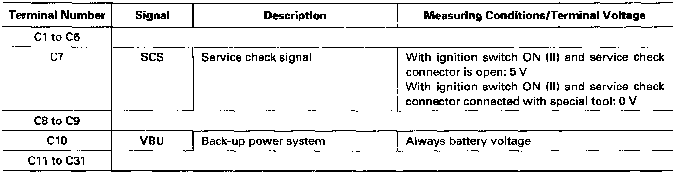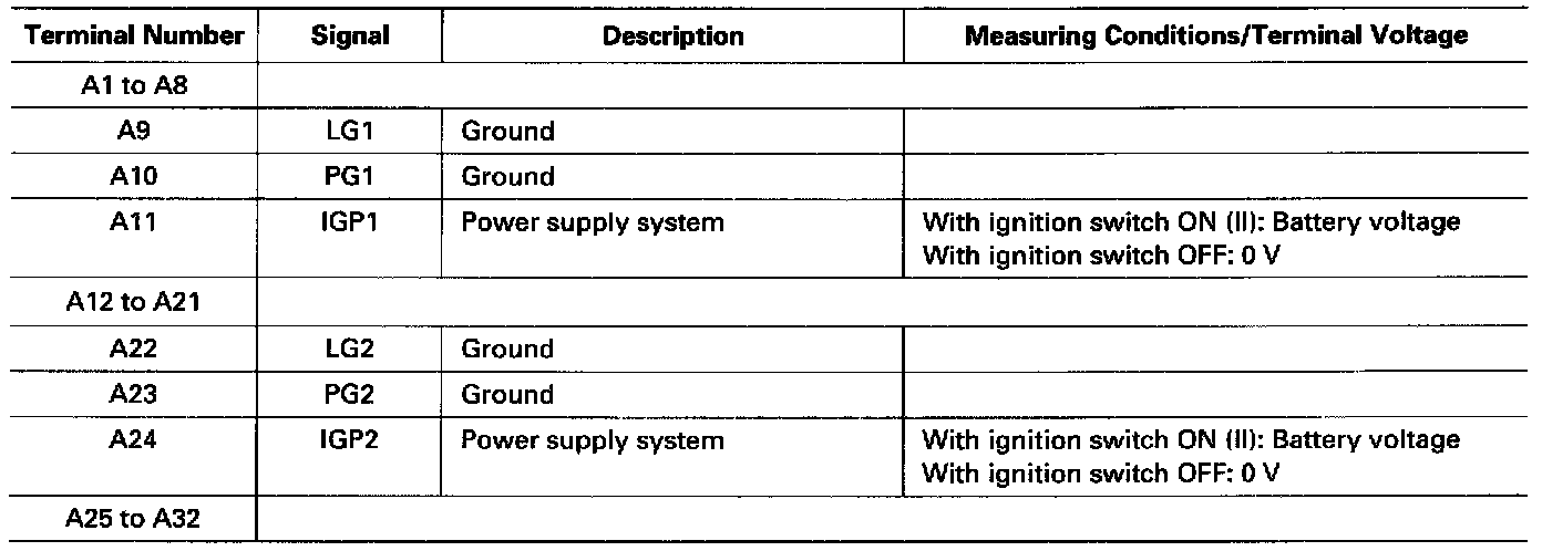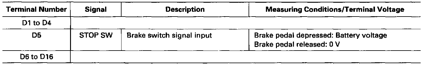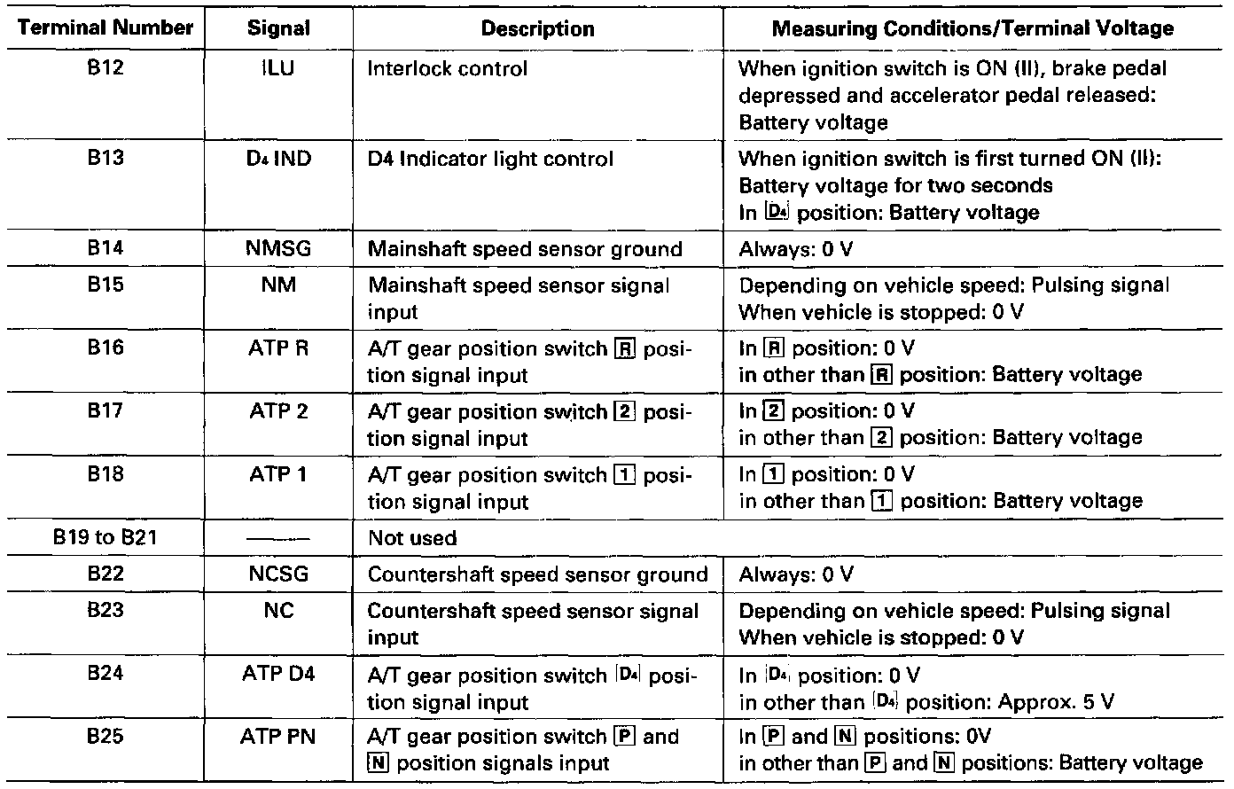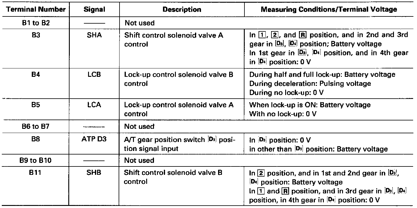 The PCM terminal voltage and measuring conditions are shown for the connector terminals that are related to the A/T control system. The other PCM terminal voltage and measuring conditions are described in Fuel and Emissions.