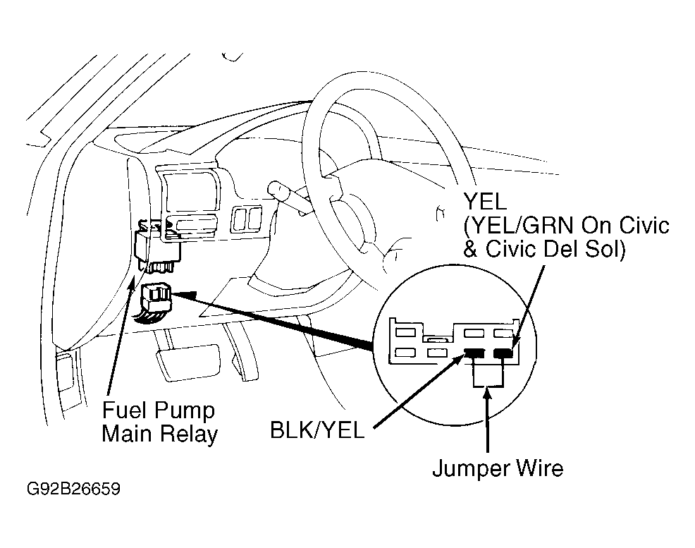 2. Remove connector from fuel pump main relay. See Fig 1 . Using a test light, check power on Black/Yellow wire at fuel pump relay connector. If power is present, go to next step. If power does not exist, repair open wire between fuel pump main relay connector and fuse No. 2 on fuse box. Go to step 4).