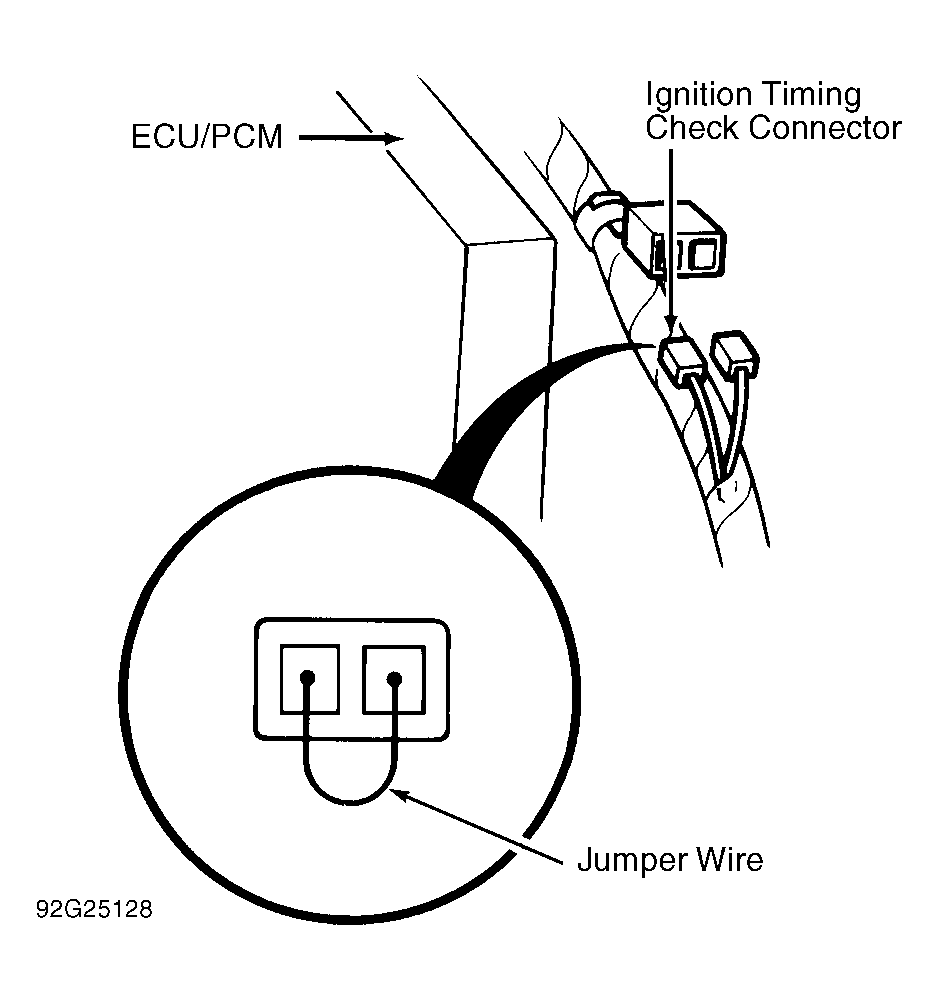2. Ignition timing check connector is located behind passenger-side kick panel. See Fig 1 . Connect jumper wire between Brown and Black wire terminals.