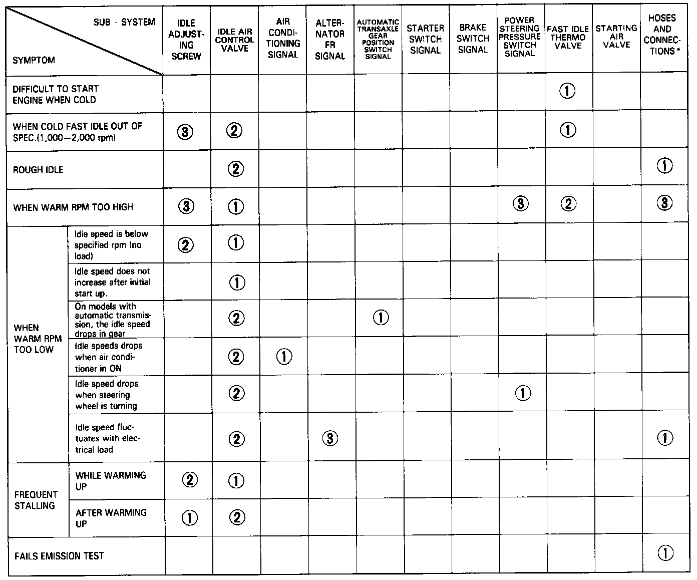 NOTE: Across each row in the chart, the sub-systems that could be sources of a symptom are ranked in the order they should be inspected, starting with (1). Find the symptom in the left column, read across to the most likely source. If inspection shows the system is OK, try the next system (2), etc.