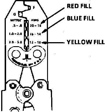 Using a crimp tool, Fig. 13, position the splice sleeve in the proper color nest of the hand crimp tool. Place the splice sleeve in the nest so that the crimp falls midway between the end of the barrel and the stop.