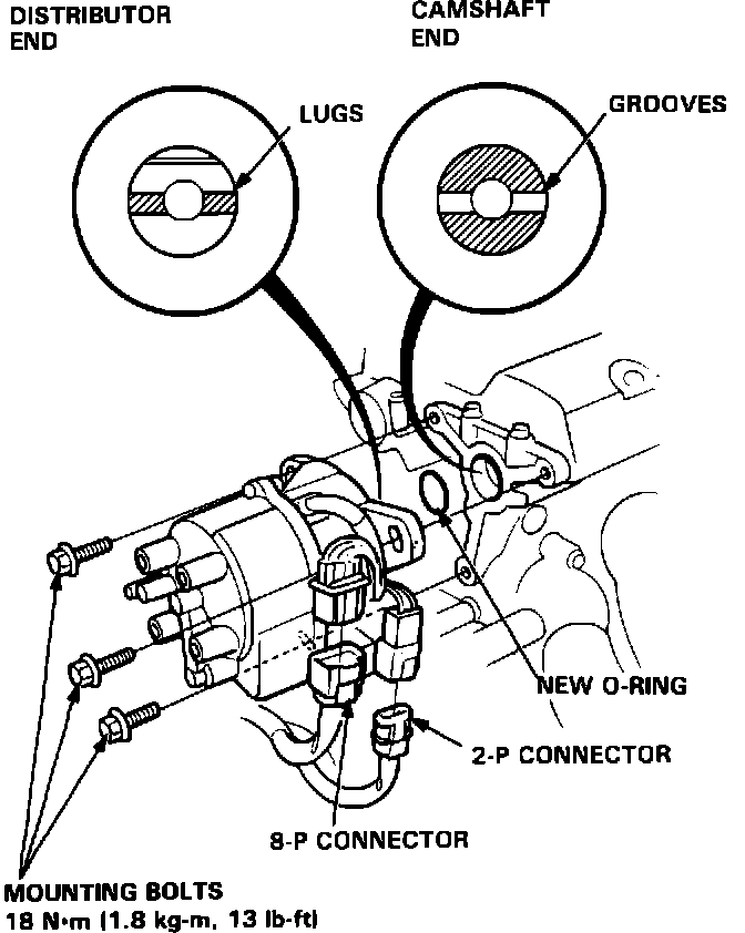 7. After adjusting, tighten the hold-down bolts. Distributor hold down bolts torque: 24 Nm (17 ft.lbs).