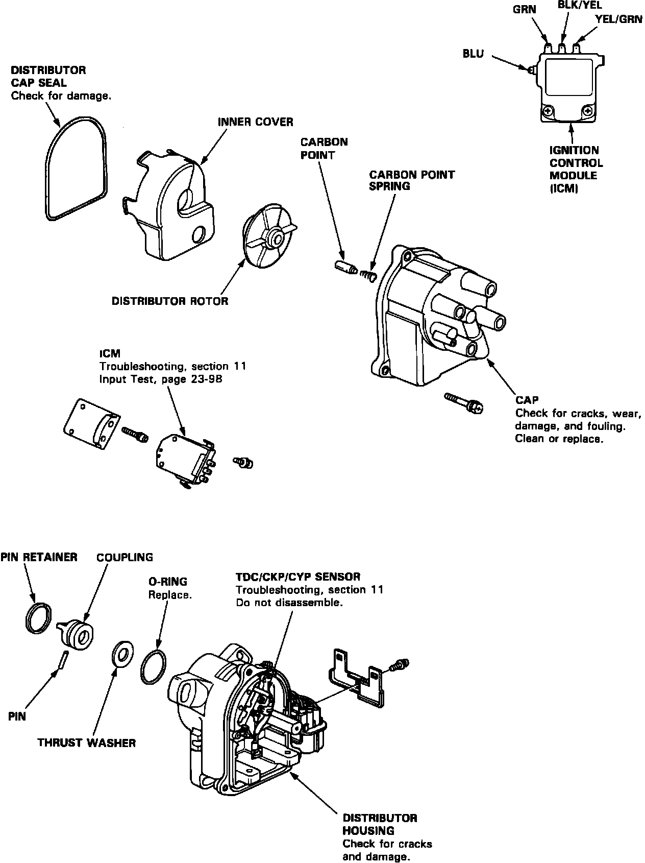 1. Using the exploded view image, disassemble the distributor as needed. The TDC/CKP/CYP Sensor is integral and cannot be removed or serviced.