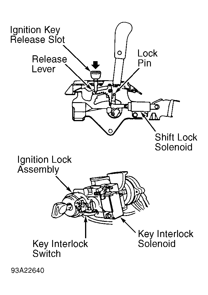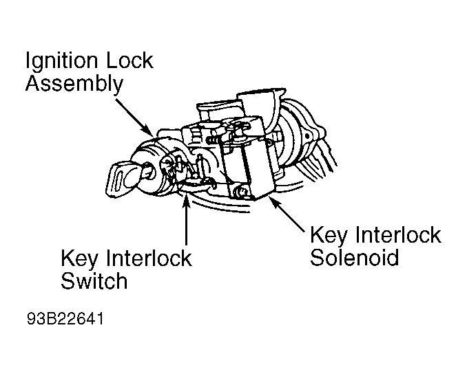 wire between No. 46 fuse and key interlock switch and key interlock solenoid. Key interlock switch and key interlock solenoid are located on ignition lock assembly. See Figure