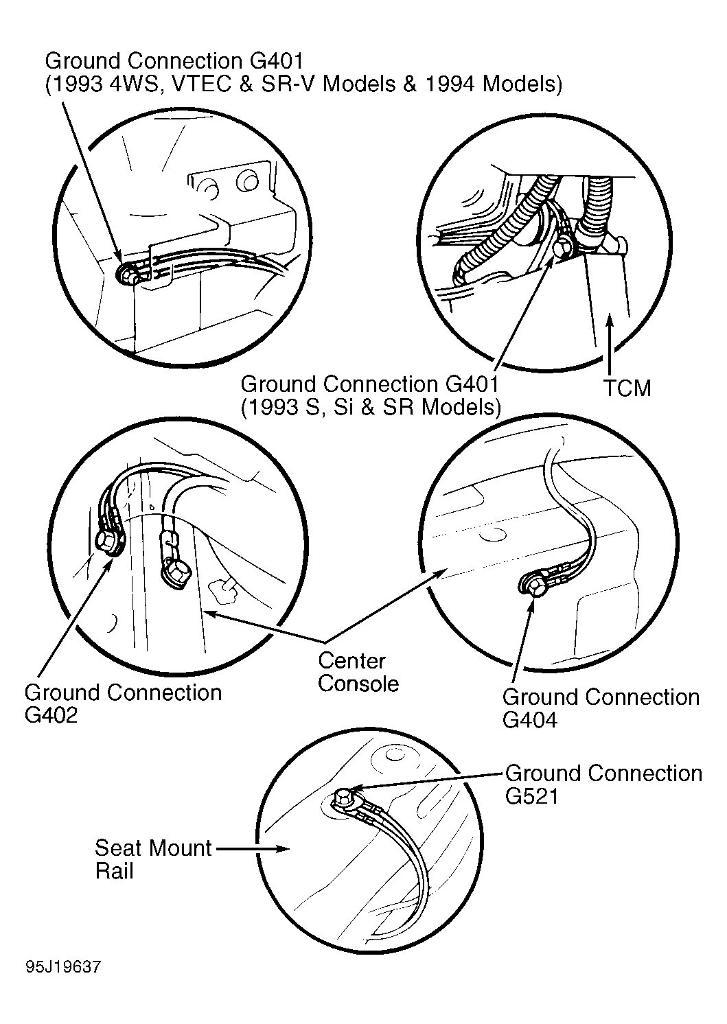 - Check for defective wiring or ground connections G401, G402, G404 and G521 (1994 models). See GROUND CONNECTION LOCATIONS
