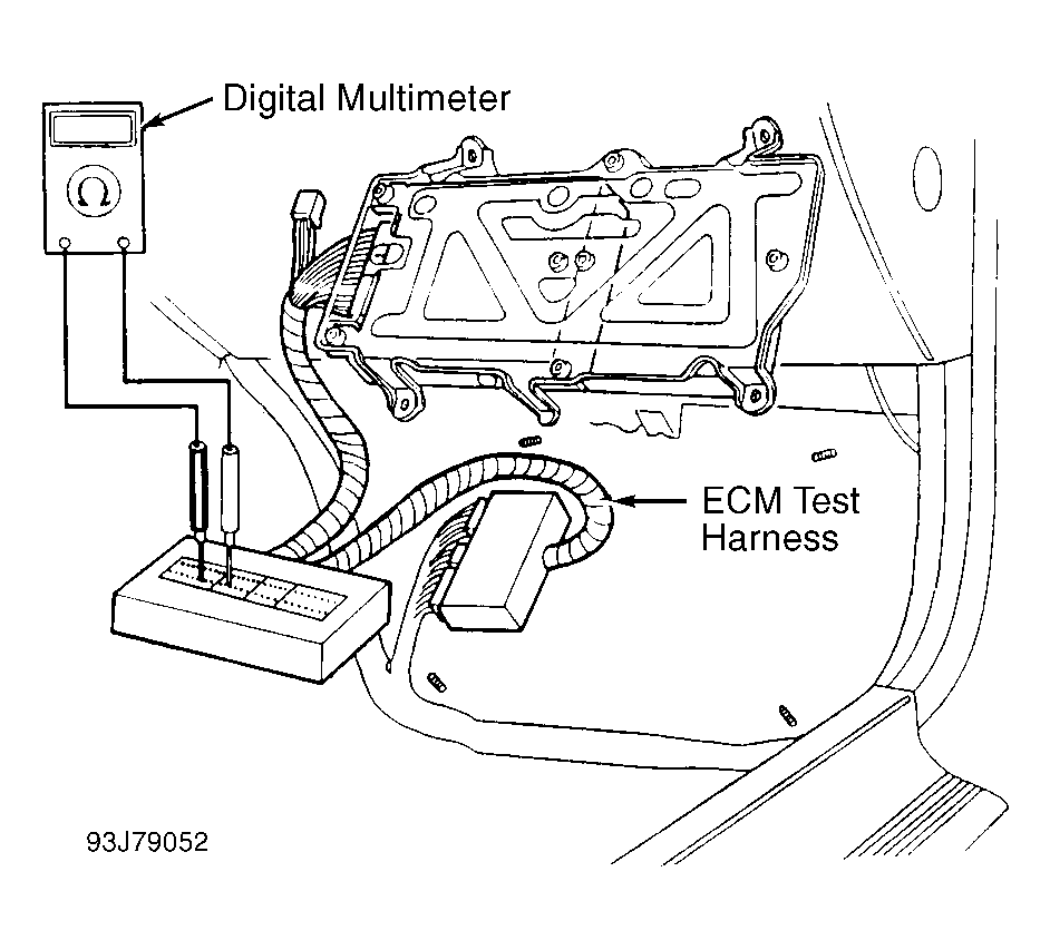 4. Turn ignition off. Reconnect ELD connector. Connect test harness between ECM and connectors. See Figure . Start engine and allow it to idle. While measuring voltage between terminals A26 and D10 of ECM connector, turn headlights on low beam. If voltage does not drop when headlights are turned on, replace ELD. If voltage drops, replace ECM with known-good unit. If voltage drop symptom disappears, replace original ECM.