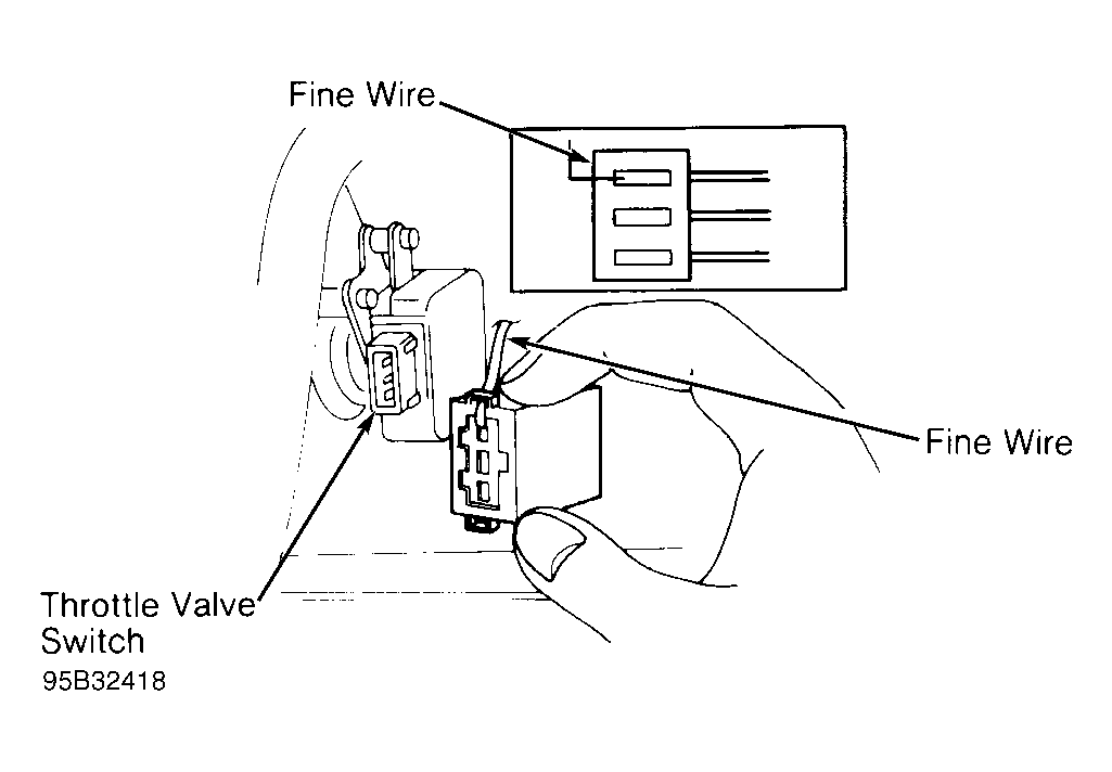 - Warm engine to operating temperature. Turn ignition off. Unplug throttle valve switch wire connector. Insert a fine wire into upper (idle) terminal. Reconnect throttle valve switch connector with fine wire partially pulled outward. See Fig 1