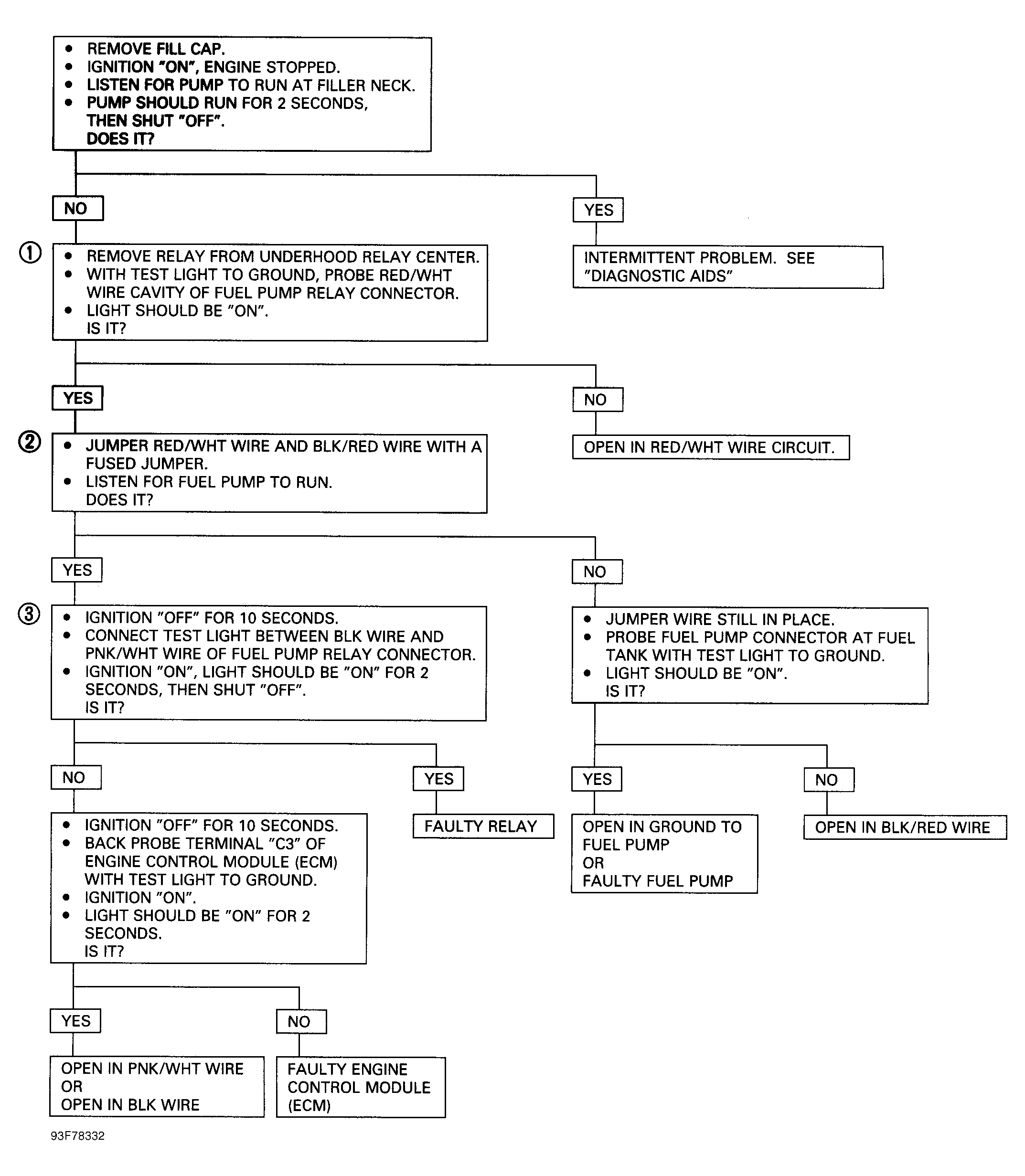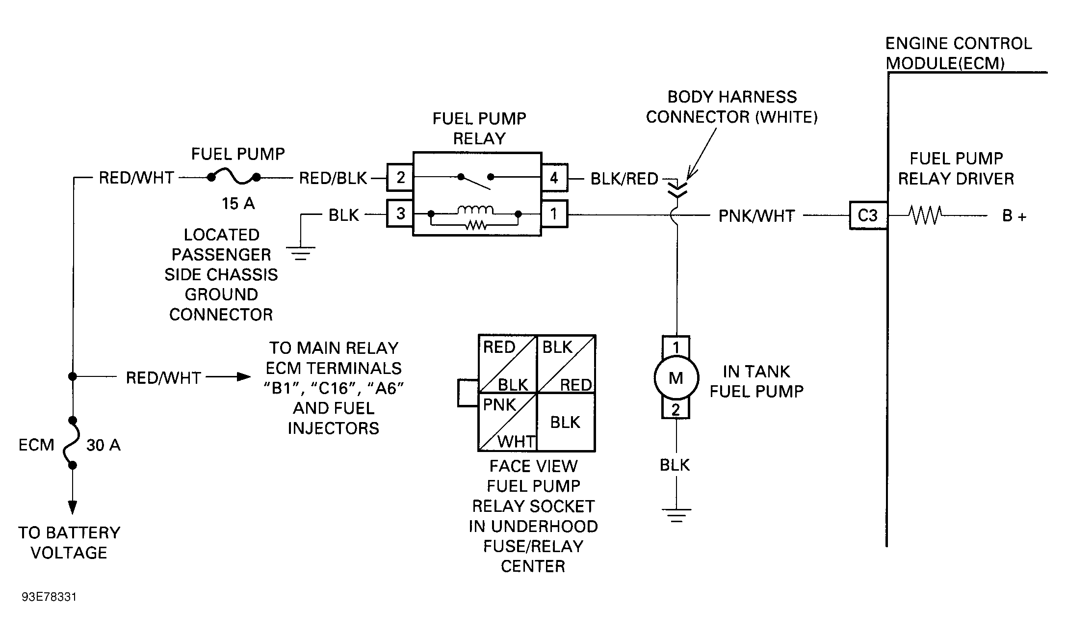 - ECM supplies power to relay as long as ECM receives ignition reference signals or starter crank signal. To run fuel pump without starting engine, remove relay and jumper terminals No. 2 and 4. See Figure