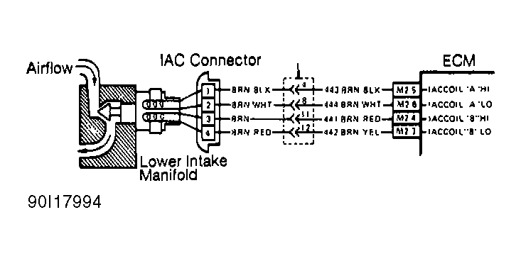 - Using ohmmeter, check continuity across terminals No. 1 and 4 and across terminals No. 2 and 3. Replace IAC valve if continuity exists. If IAC valve tests okay, check for faulty connections at IAC valve and ECM. If connections are okay, check input devices used by ECM to control IAC valve operation. See Figure .