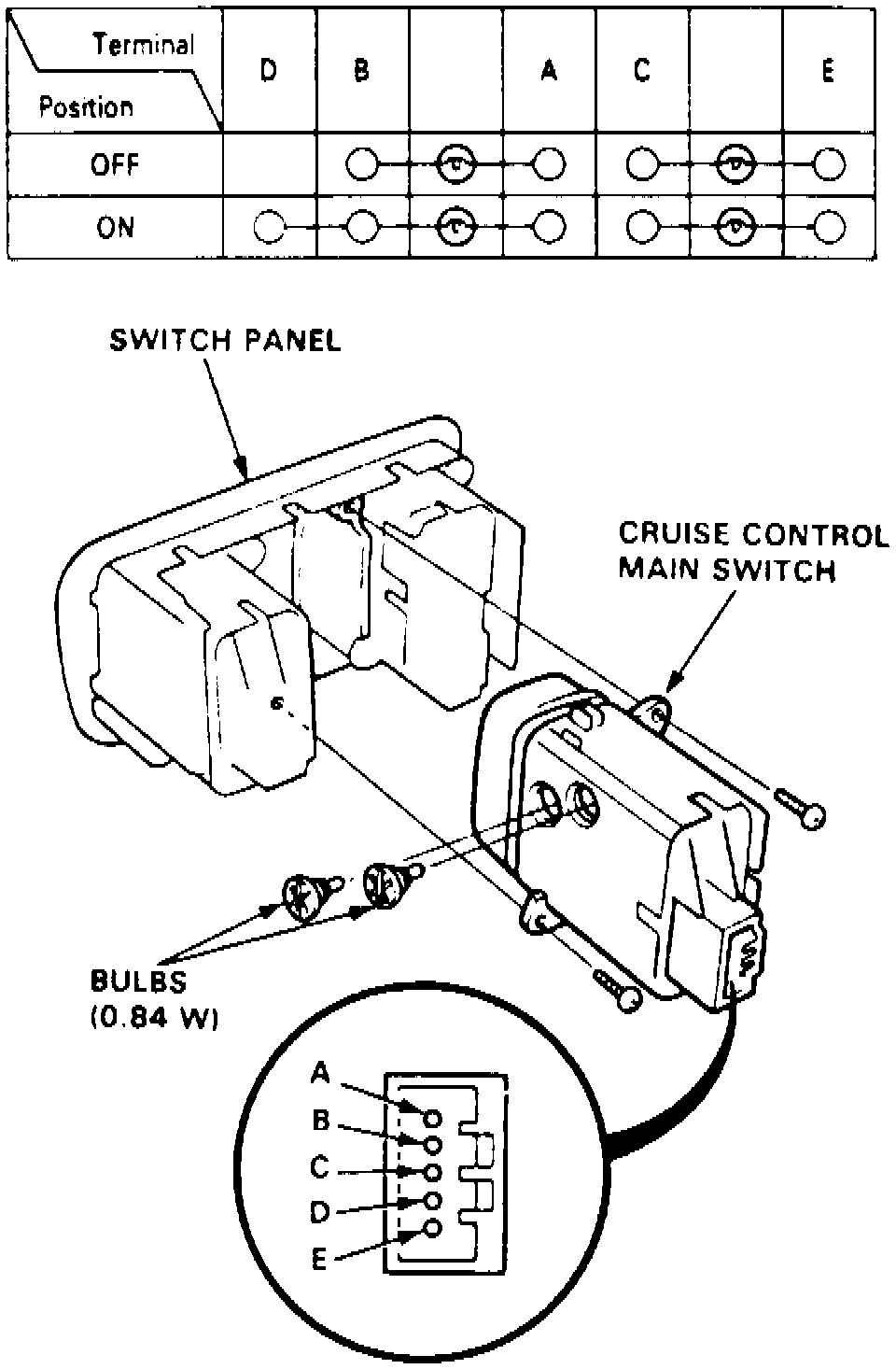 1. Carefully remove switch from instrument panel and disconnect electrical connectors.2. Remove cruise control switch from switch panel.