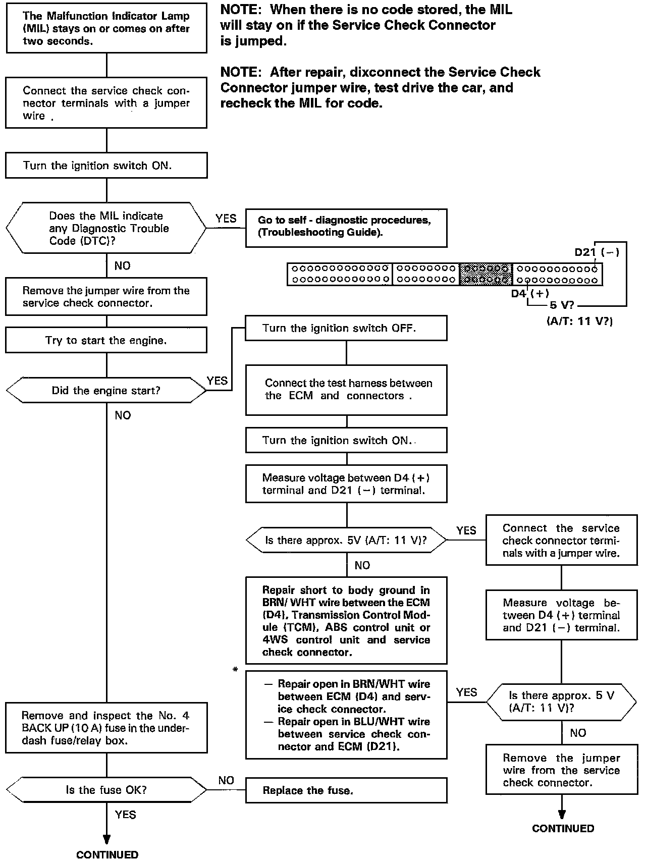 NOTE: When there is no code stored, the Malfunction Indicator Lamp (MIL) will stay on if the Service Check Connector is shorted and the Ignition Switch is on.