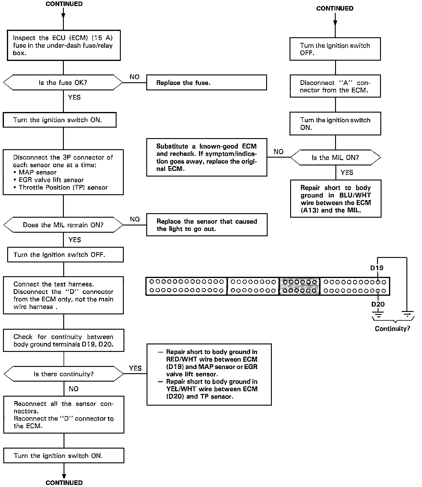 NOTE: After repair, disconnect the Service Check Connector jumper wire, test drive the car, and recheck the MIL for code.