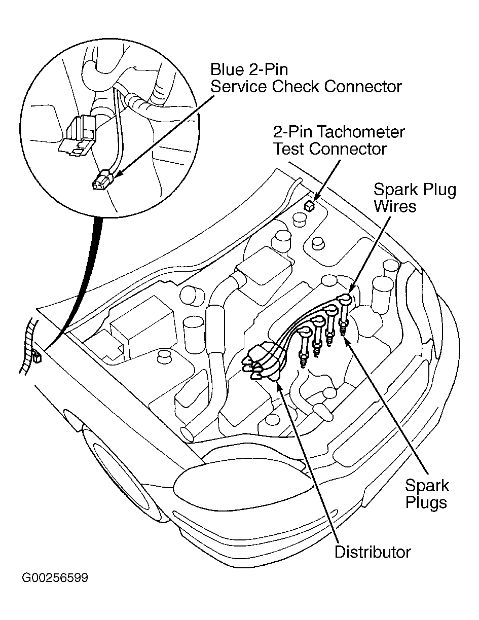 - Start engine and run under no-load condition until cooling fan comes on. Let engine idle. Locate Blue 2-pin service check connector, located below right side of dash at kick panel, and pull it out of its holder. Service check connector contains a Brown wire and Black wire. See Figure and Figure . Install SCS Service Connector (07PAZ-0010100) in Blue 2-pin service check connector. See Fig 1 .