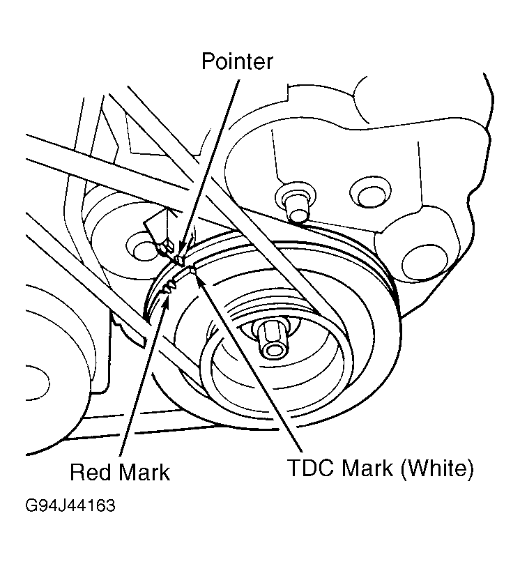 - Attach tachometer to tachometer test connector (White, 2-pin with cover) located in right rear of engine compartment. Check idle speed and adjust as necessary. See IDLE SPEED under IDLE SPEED & MIXTURE. Connect timing light to spark plug wire No. 1. Check base ignition timing. Timing marks are located on timing belt cover and crankshaft pulley. Red mark indicates 15 degrees BTDC. White mark indicates TDC. See Fig 2 . See IGNITION TIMING .