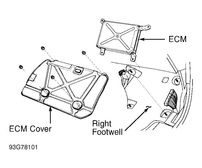 Disconnect negative battery terminal. Remove right door sill molding. Pull front passenger side carpet back to access ECM. See Fig 1. Remove ECM cover screws. Unplug ECM connectors. Remove mounting screws. Remove ECM. To install, reverse removal procedure.