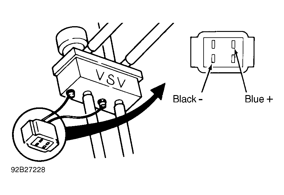 - Unplug fuel pressure regulator Vacuum Switching Valve (VSV) connector on right side fender skirt. This is a 4-wire connector with Black and Blue wires in harness. PCM controls VSV to cut vacuum to fuel pressure regulator during hot engine starts.