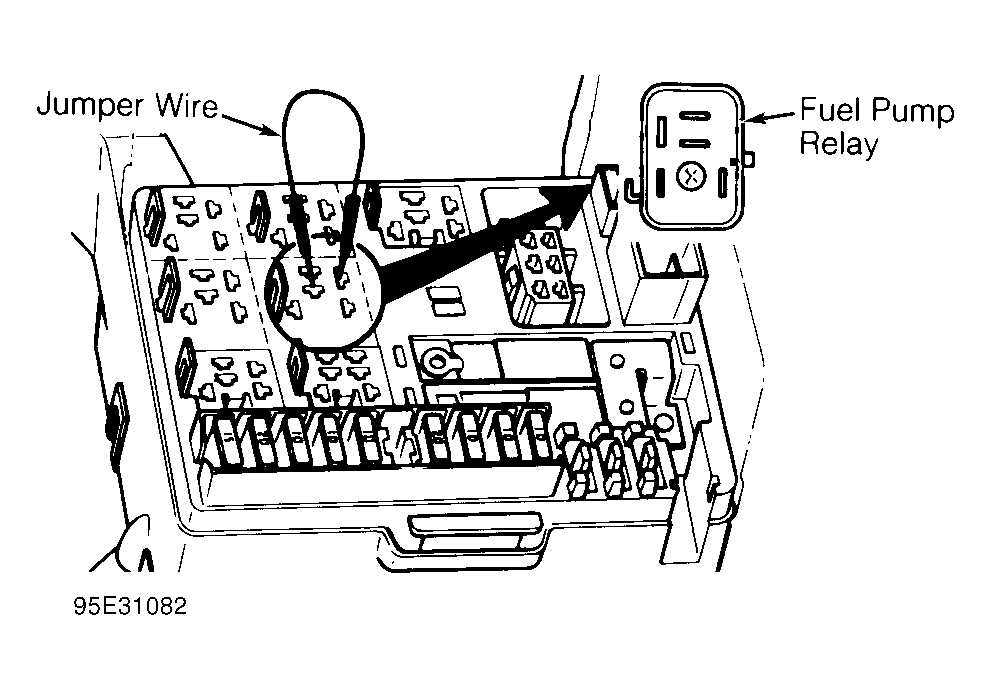 - If pressure drops, check for leaking injectors, faulty pressure regulator or bad check valve in fuel pump. If engine does not start, by-pass fuel pump relay to check for fuel pressure. Remove fuel pump relay from underhood fuse/relay box. Connect a fused jumper wire between terminals No. 1 and 3 of fuel pump relay connector in fuse block. See Fig 3 and Fig 4 .
