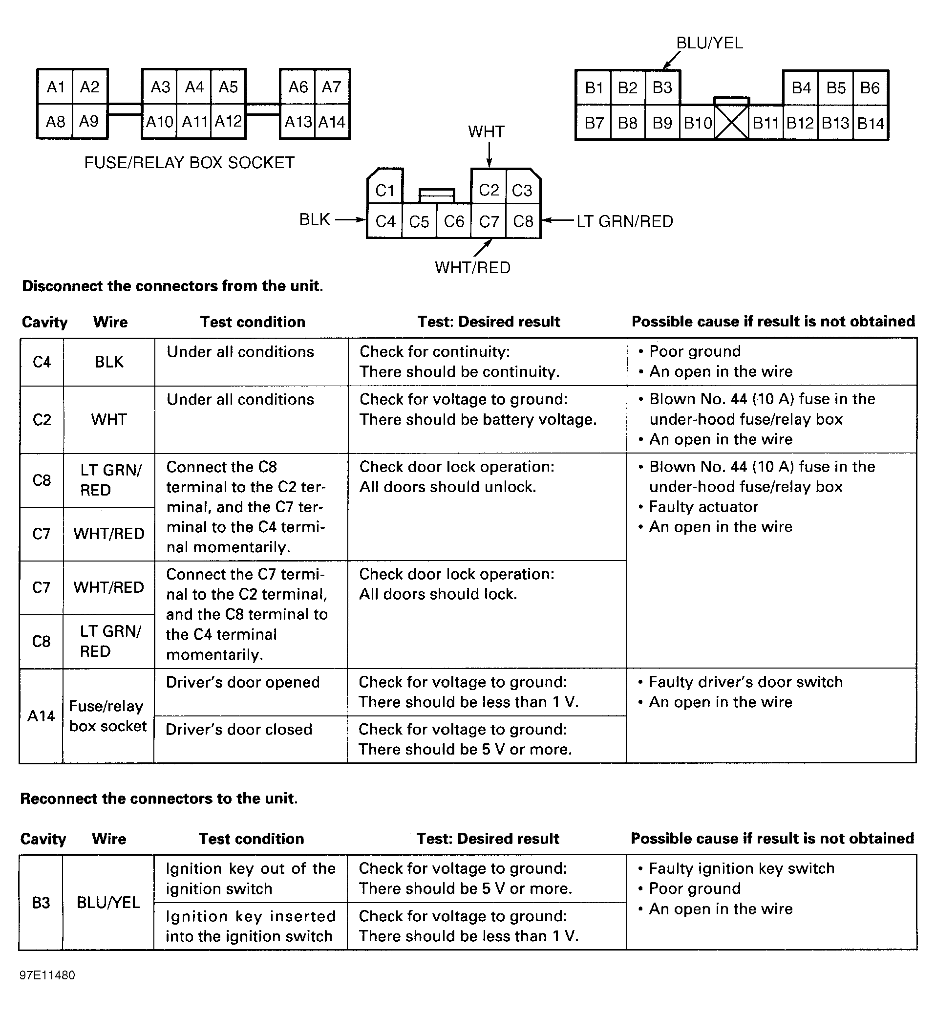 Remove underdash fuse/relay box. Remove driver's unit from underdash fuse/relay box. Inspect connector terminals for damage or corrosion. Repair of replace as necessary. Using a DVOM, perform driver's control unit input test. See Fig 1 . If all input tests are okay, replace driver's multiplex control unit.
