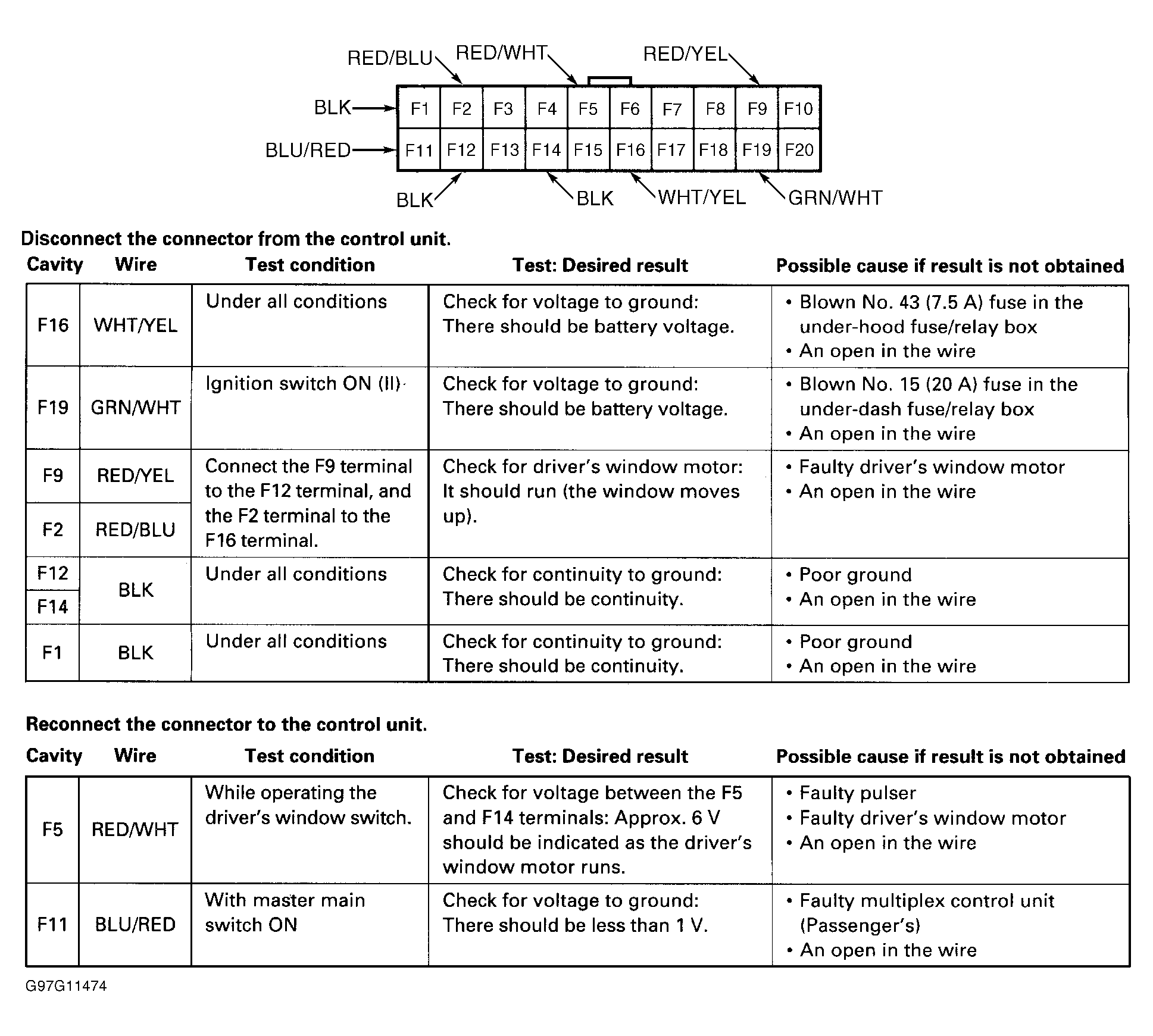 Remove driver's door trim panel. Disconnect 20-pin harness connector. Inspect connector terminals for damage or corrosion. Repair or replace as necessary. Using a DVOM, perform driver's control unit input test. See Fig 1 . If all input tests are okay, replace door multiplex control unit.