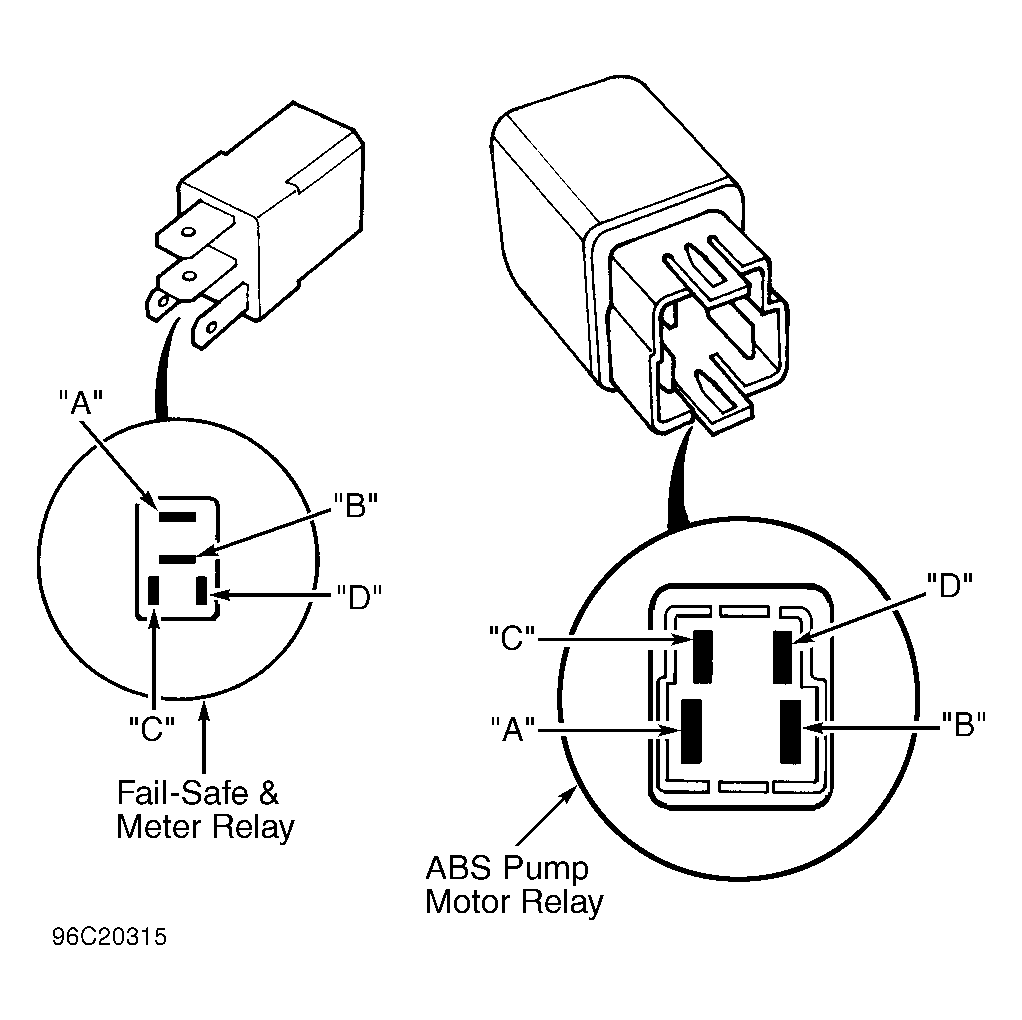 Check continuity between relay terminals "A" and "B". See Fig 1 . Continuity should not exist. Apply battery voltage across terminals "C" and "D". Continuity should exist between terminals "A" and "B". If continuity is not as indicated, replace relay.