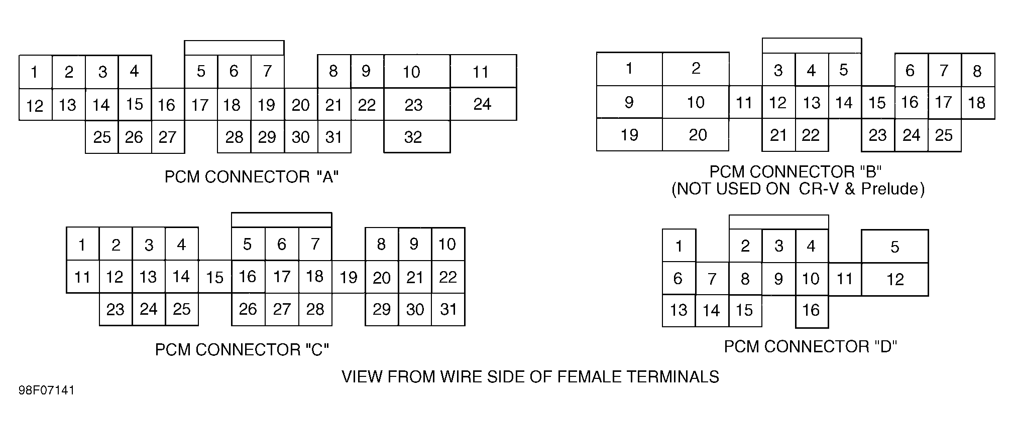 2. Turn ignition off. Reconnect A/C pressure switch (all models) and A/C diode (Oasis, Odyssey & Prelude) connectors. Turn ignition on. Using a fused jumper wire, momentarily connect PCM connector terminals A17 and B20 (Accord, Oasis & Odyssey) or terminals A9 and A17 (Civic, CR-V, Oasis & Odyssey), several times. See Figure . If A/C compressor clutch makes a clicking sound, go to next step. If A/C compressor clutch does not make a clicking sound, go to step 5).