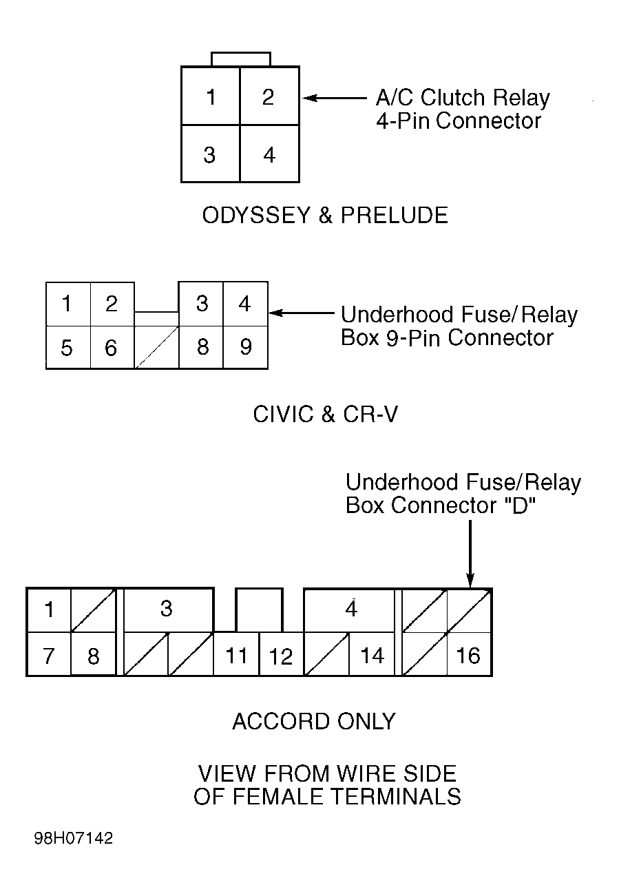 4. Using a fused jumper wire, momentarily connect under-hood fuse/relay box 16-pin connector terminal No. 11 (Accord) or under-hood fuse/relay box 9-pin connector terminal No. 5 (Civic & CR-V) or A/C clutch relay connector terminal No. 4 (Oasis, Odyssey & Prelude)to ground several times. to ground several times. See Fig 1 & 6. See A/C SIGNAL COMPONENT LOCATIONS  . If A/C compressor clutch makes a clicking sound, repair open in wire between A/C clutch relay and PCM connector terminal A17 (all models). See WIRING DIAGRAMS article. If A/C compressor clutch does not make a clicking sound, inspect A/C system. Refer to appropriate A/C - HEATER SYSTEM article in the AIR CONDITIONING & HEAT section.
