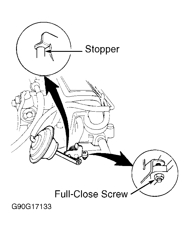 Check valve shaft for binding and sticking, and ensure movement is smooth. Turn engine off. Ensure tab on IAB control valve contacts stop. See Fig 1 . Start engine and allow to idle. Ensure tab of IAB control valve contacts full-close screw. If any fault is found, clean linkage and shafts using carburetor cleaner. If problem still exists after cleaning, disassemble intake manifold and inspect IAB valve assembly.