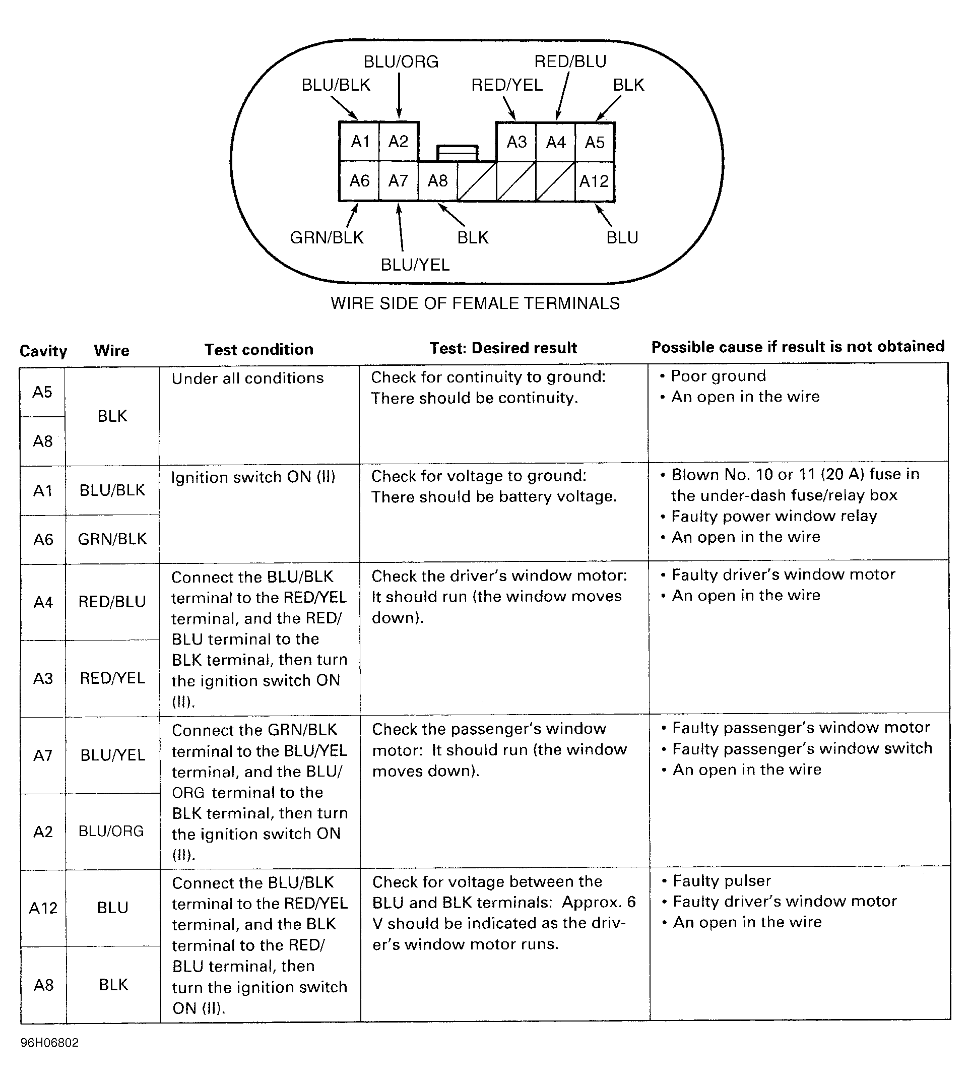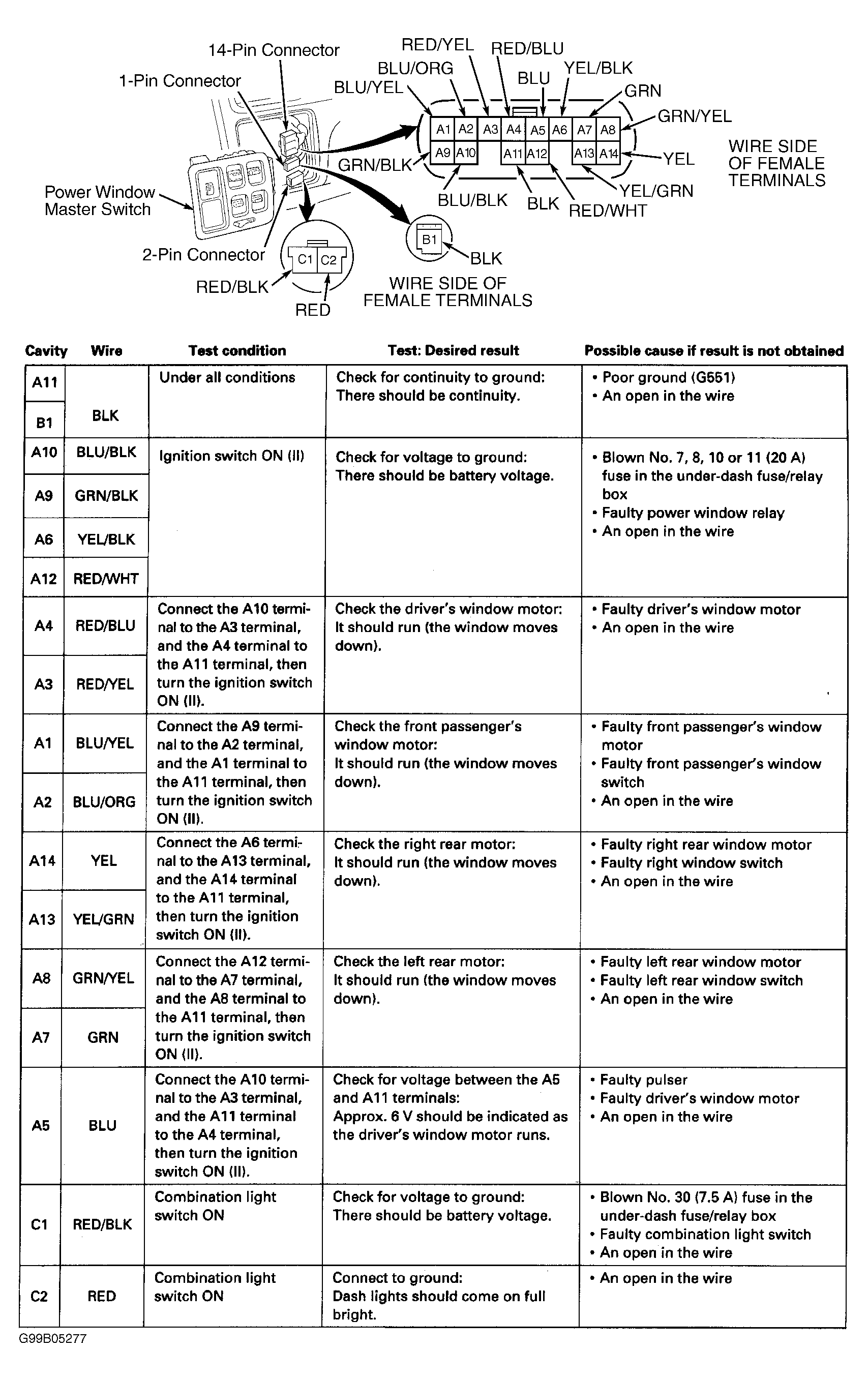 Turn ignition off. Remove driver's door panel. See DOOR PANEL under REMOVAL & INSTALLATION. Unplug connectors from master switch. Using a DVOM, perform appropriate switch input tests. See Fig 1 -Fig 3 . If all input test results are okay, inspect connector and terminals for damage and proper fit. If connector is okay and power windows still malfunction, replace master switch.