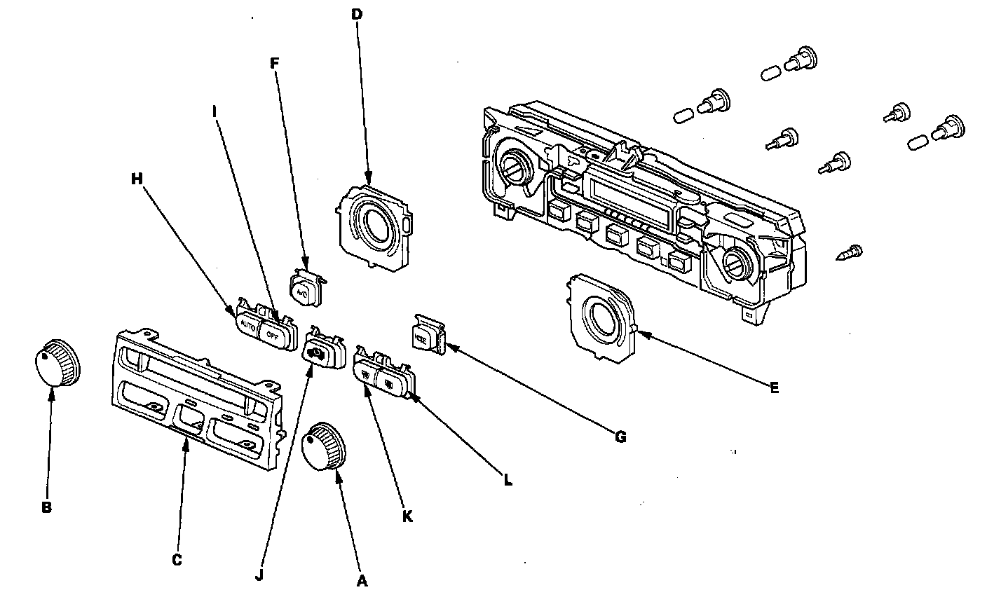 1. Remove the fan switch (A) and temperature control (B) dials, then remove the front (C), temperature control (D) and fan switch (E) panels. Remove the A/C switch (F), MODE control switch (G), AUTO switch (H), OFF switch (I), recirculation control switch (J), front defroster switch (K) and rear defogger switch (L) buttons.