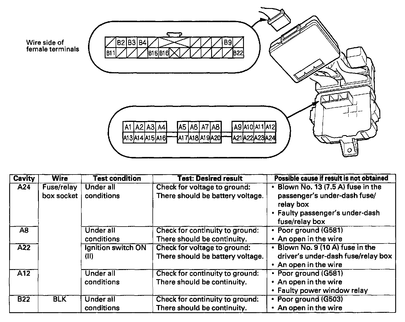 9. Make the following input tests at the connector B and the fuse/relay box socket.