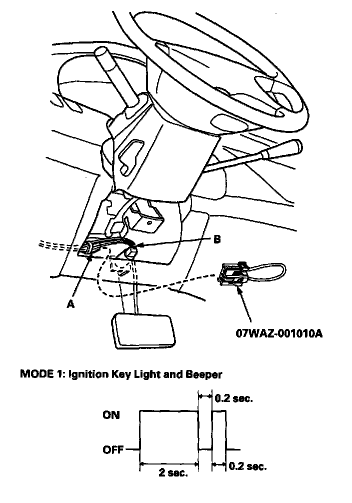 3. Check self-diagnosis function Mode 1 for a diagnostic trouble code (DTC) by connecting the special tool to the multiplex control inspection connector (A) taped to the brake switch harness (B). After about five seconds, the ignition key light should come on and the beeper should beep for 2 seconds, go off for 0.2 second, then blink and beep for 0.2 second. This means that you are in Mode 1 of the self-diagnosis function.