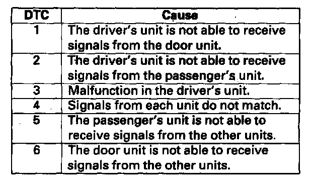 7. One second after you go into self-diagnosis mode 1, the ignition key light and beeper indicate the DTC, and repeat it every three seconds. If there is more than one DTC, the system will indicate them in ascending order, beginning from the DTC with the lowest numerical value. Find your DTC in this table, then go to step 8 and check the communication lines.