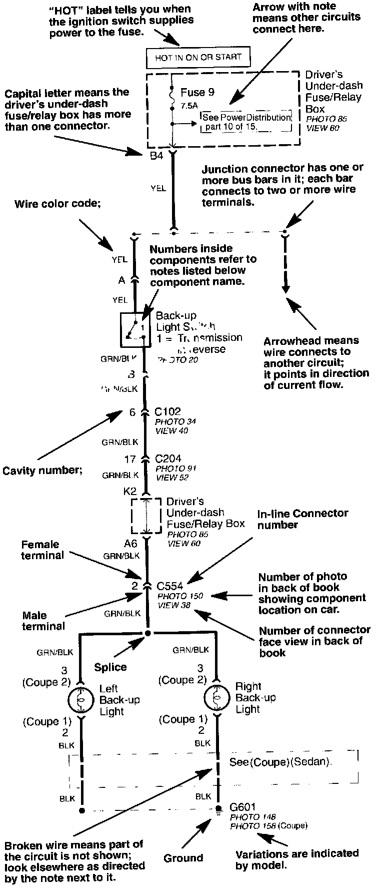 Other circuits may share power or ground terminals or wiring with the circuit shown. A wire that connects one circuit to another, for example, is cut short and has an arrowhead at the end of it pointing in the direction of current flow. Next to the arrowhead is the name of the circuit or component which shares that wiring. To quickly check shared wiring, check the operation of a component it serves. If that component works, you know the shared wiring is OK.
