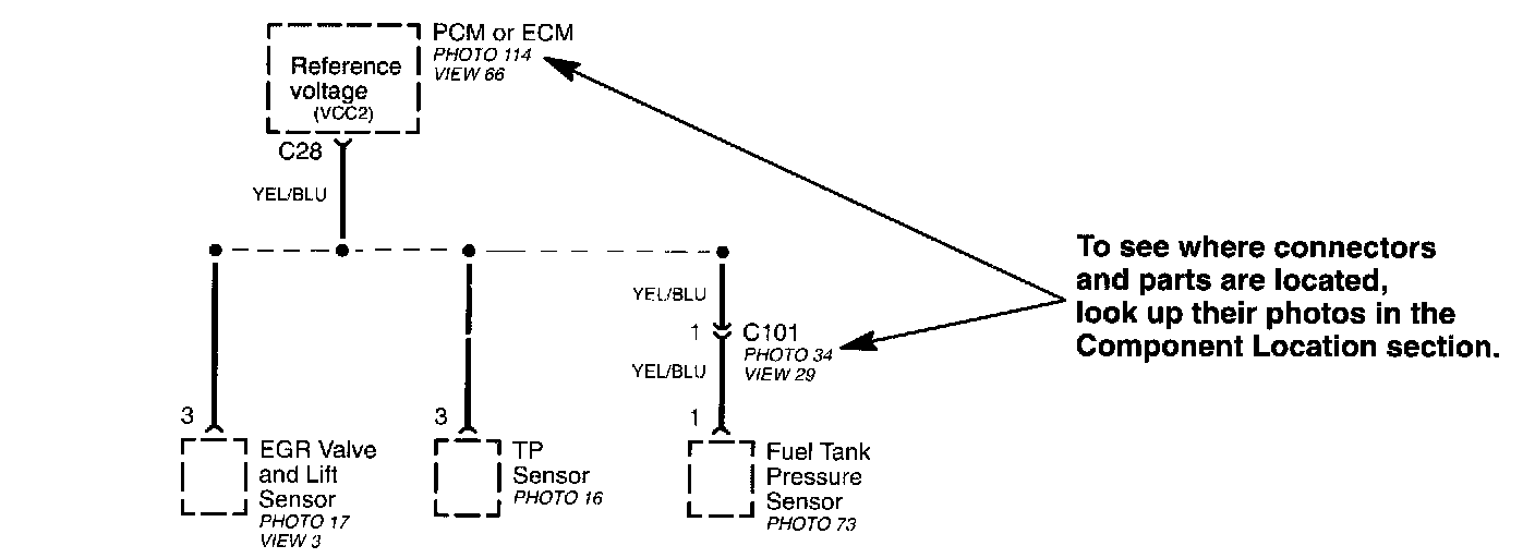 To see where a component or connector is located on the car, look up its photo number in Locations/Components/Photographs. The photo will also tell you the color of the connector, and how many cavities it has.