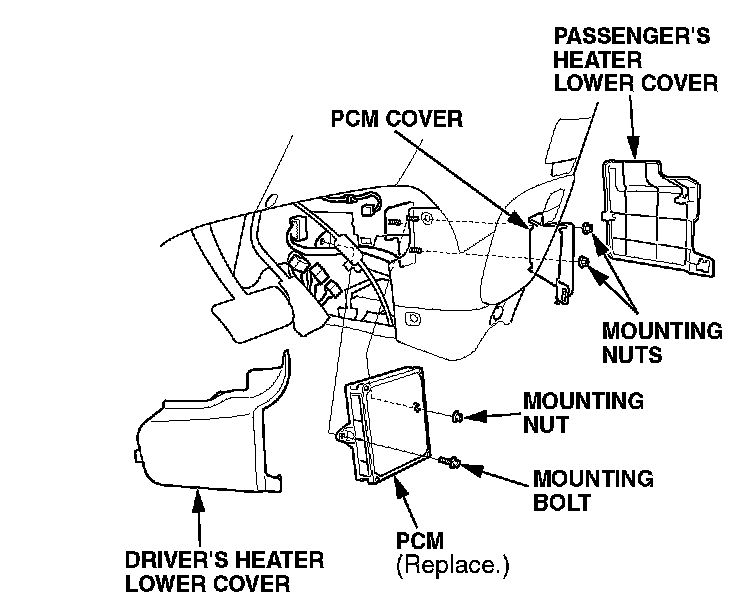 1. Pull back the carpet. Remove the driver's and passenger's heater lower covers to access the PCM.