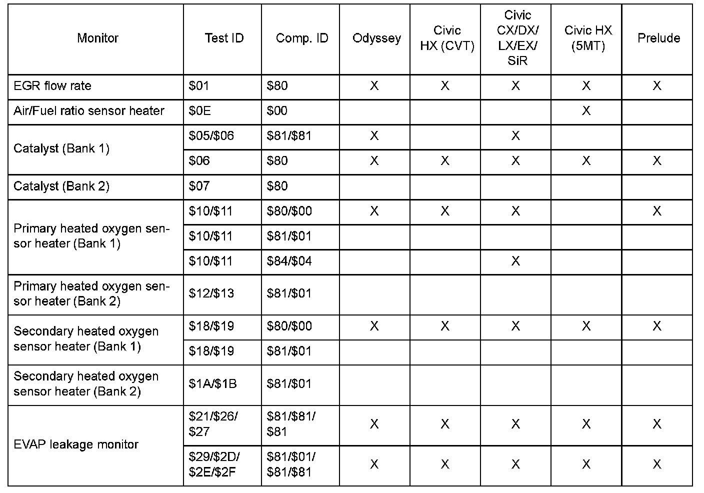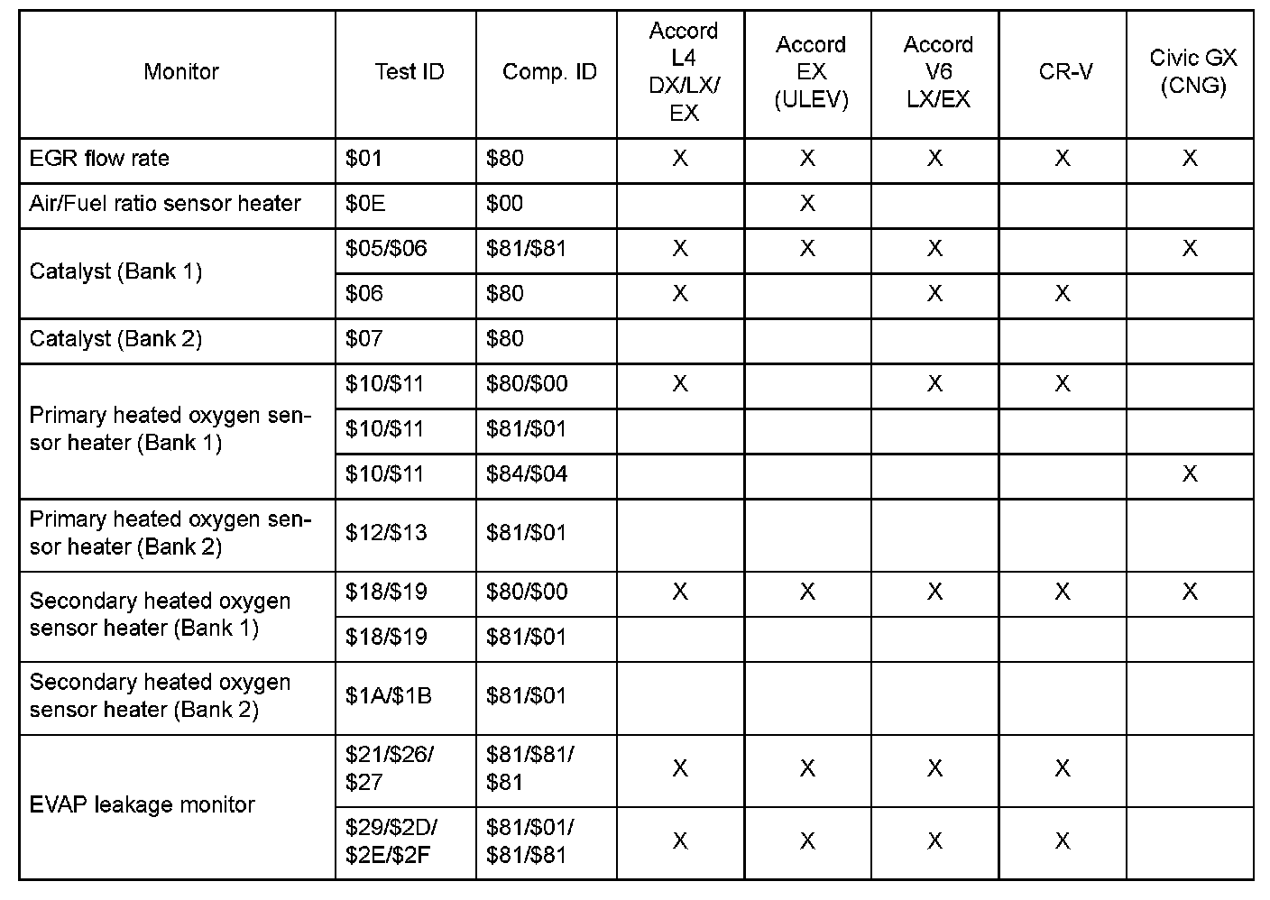 SAE J1979 Mode $06 Test Information: All 1999 Hondas