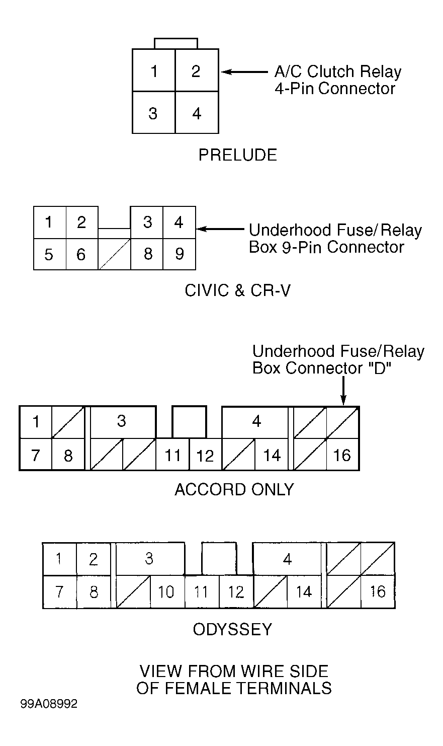 - On Civic, using backprobe set, momentarily connect a fused jumper wire between ground and under-hood fuse/relay box 9-pin connector terminal No. 5 (Black/Red wire on CR-V), several times. See Fig 1. On Prelude, Using backprobe set, momentarily connect a fused jumper wire between ground and A/C clutch relay connector terminal No. 4 (Pink/Blue wire), several times. See Fig 1. See A/C SIGNAL COMPONENT LOCATIONS table. On all models, if A/C compressor clutch makes a clicking sound, repair open in Black/Red wire (Civic) or Pink/Blue wire (Prelude) between A/C clutch relay and PCM 32-pin connector "A" terminal No. 17. See WIRING DIAGRAMS article. If A/C compressor clutch does not make a clicking sound, inspect A/C system. See appropriate article in A/C-HEATER SYSTEMS.