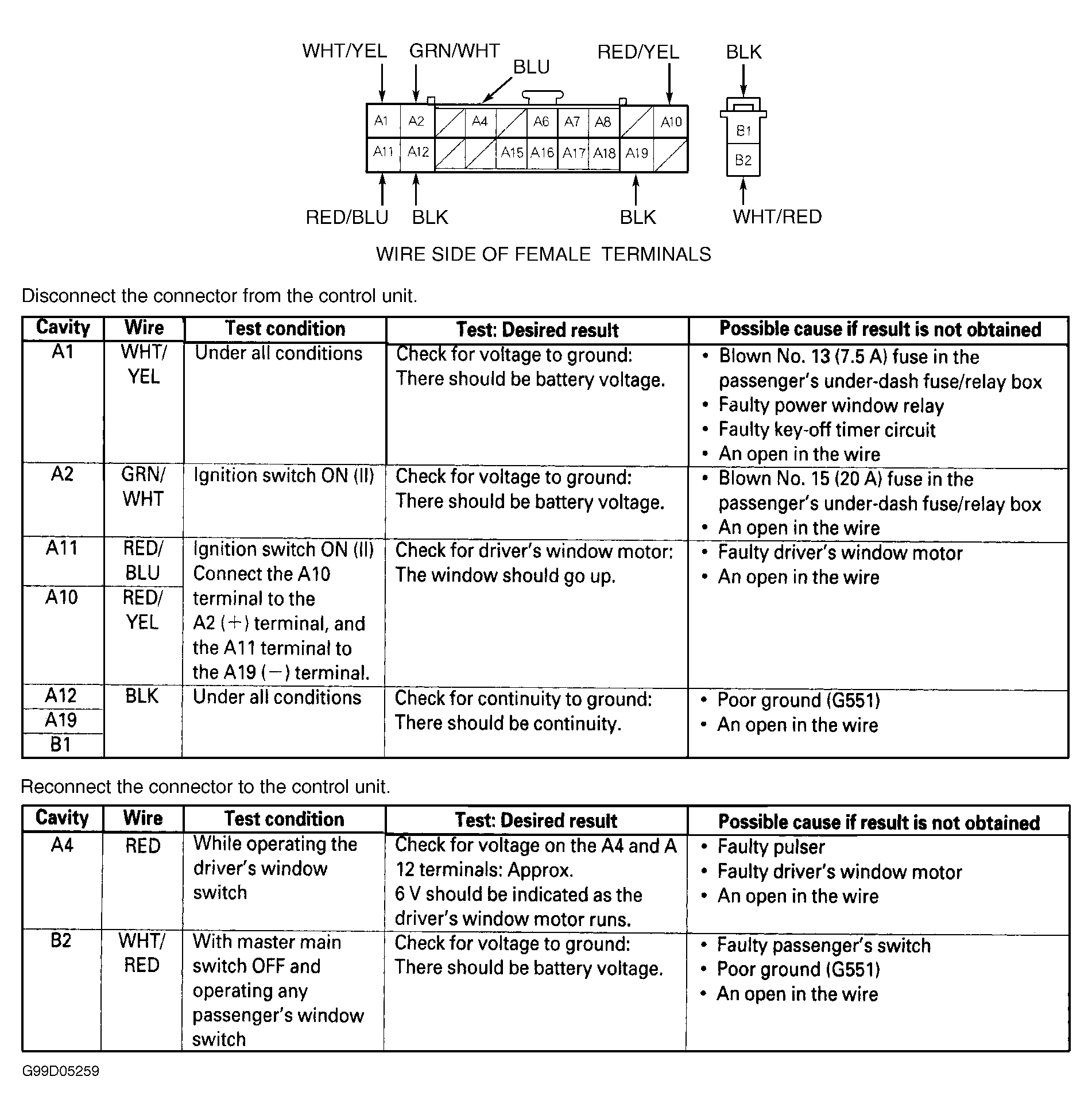 Remove driver's door trim panel. Disconnect 20-pin harness connector. Inspect connector terminals for damage or corrosion. Repair or replace as necessary. Using a DVOM, perform driver's control unit input test. See Fig 1