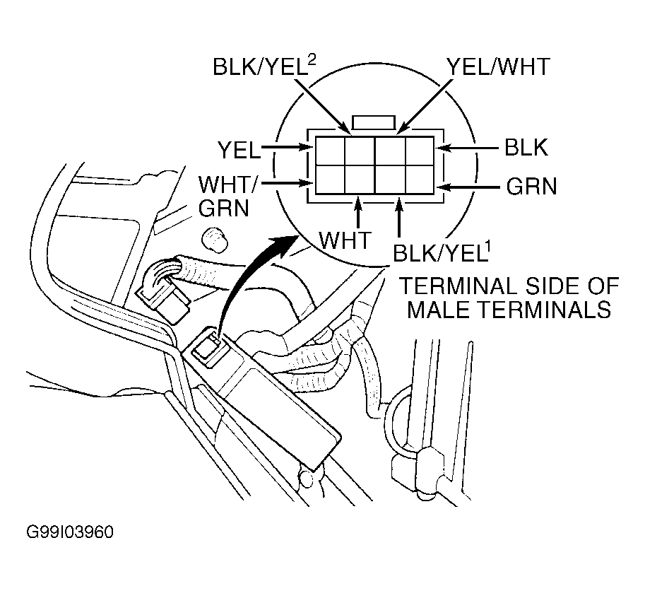 - Measure voltage between ground and (backprobe) terminal No. 1 (Yellow wire) of radiator fan control module. If battery voltage exists, go to next step. If battery voltage does not exist, repair open in Yellow wire between radiator fan control module and terminal No. 3 of radiator fan relay. If wire is okay, replace radiator fan control module (located behind glove box).