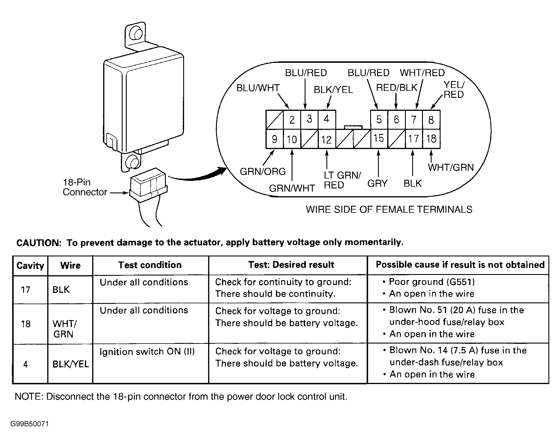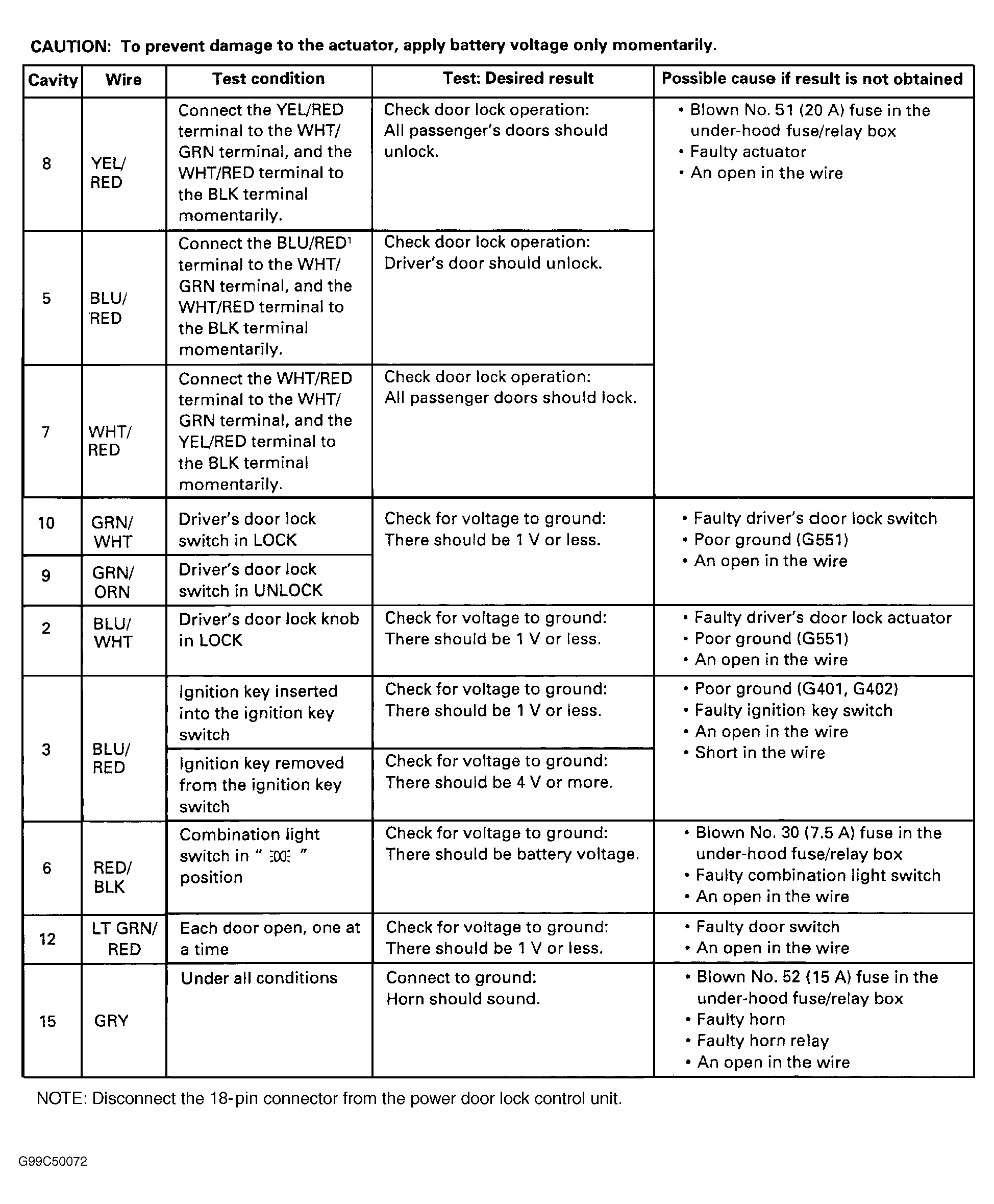 . If all input test results are okay, inspect connector and terminals for damage and proper fit. If connector is okay and power door lock still malfunctions, replace power door lock control unit.