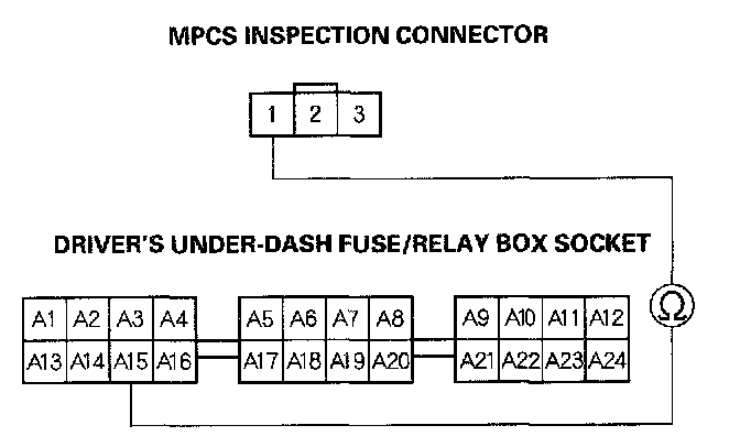 13. Check for continuity between No.1 terminal of the MPCS inspection connector and the No.15 terminal of the driver's under-dash fuse/relay box socket.