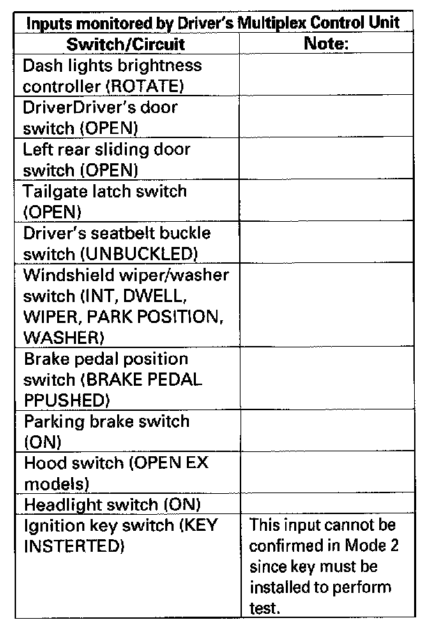 Home >> Honda >> 2000 >> Odyssey EX V6-3.5L >> Repair and Diagnosis >> Body and Frame >> Body Control Systems >> Testing and Inspection >> Multiplex Control System Troubleshooting